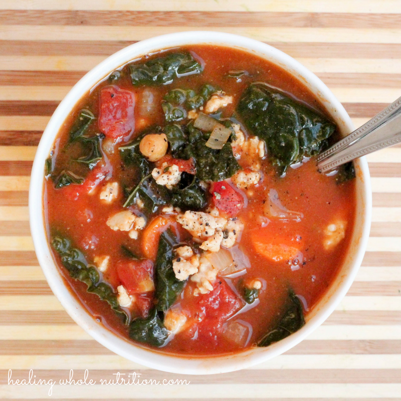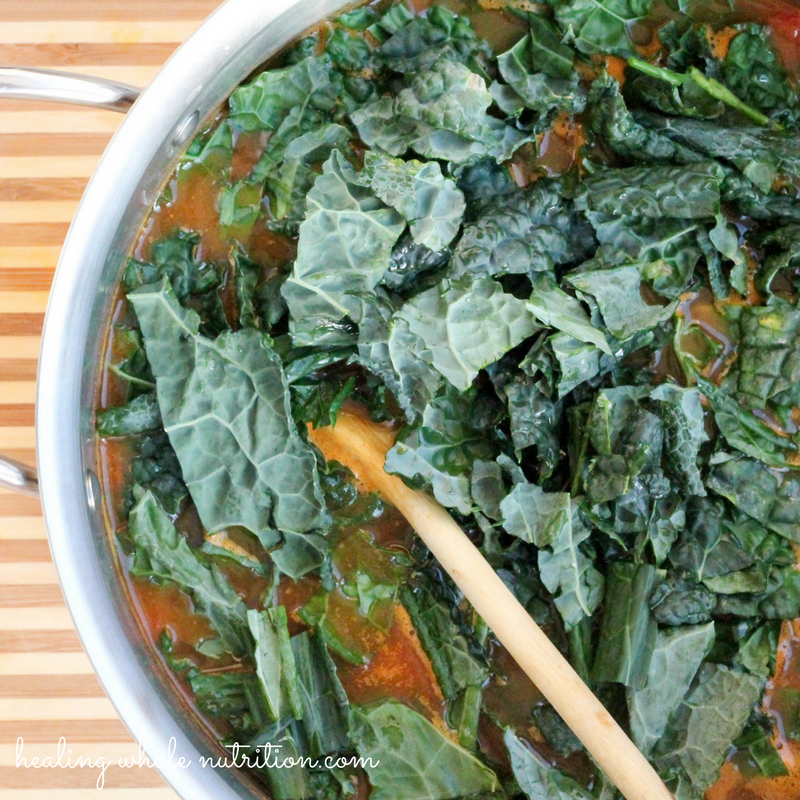- Add the tomatoes, broth, chickpeas, chopped kale and cooked turkey and stir to combine once the kale has started to wilt