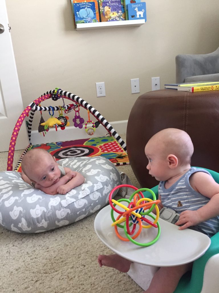 Milestones! Itâs so fun to see your baby reach milestones and gain independence. I am not one of those moms that gets teary eyed or sad when my baby turns another month older or reaches a milestone because that is just one step closer to my life being easier! Could be a twin thing, but I canât wait for them to hold a bottle on their own, sit up on their own, play on their own, etc. Remy is a crazy baby and rolled over at 5 weeks old. He also has always loved tummy time and is such a pro in that arena. Jack on the other hand is just now starting to master tummy time without crying his head off. He rolled over around 10 weeks, but doesnât do it all the time (neither does Remy). They have both mastered the mini baby pushup which is where they place weight on their forearms or hands and push up during tummy time - probably the cutest thing ever! Theyâre also both working on sitting up and whenever we put them in their boppys they try to sit up and get so happy when we grab their hands and pull them to sitting. They also do a pretty good job in their bumbo seats and their jumperoo. They both babble all the time - especially at night and in the morning and itâs so cute!